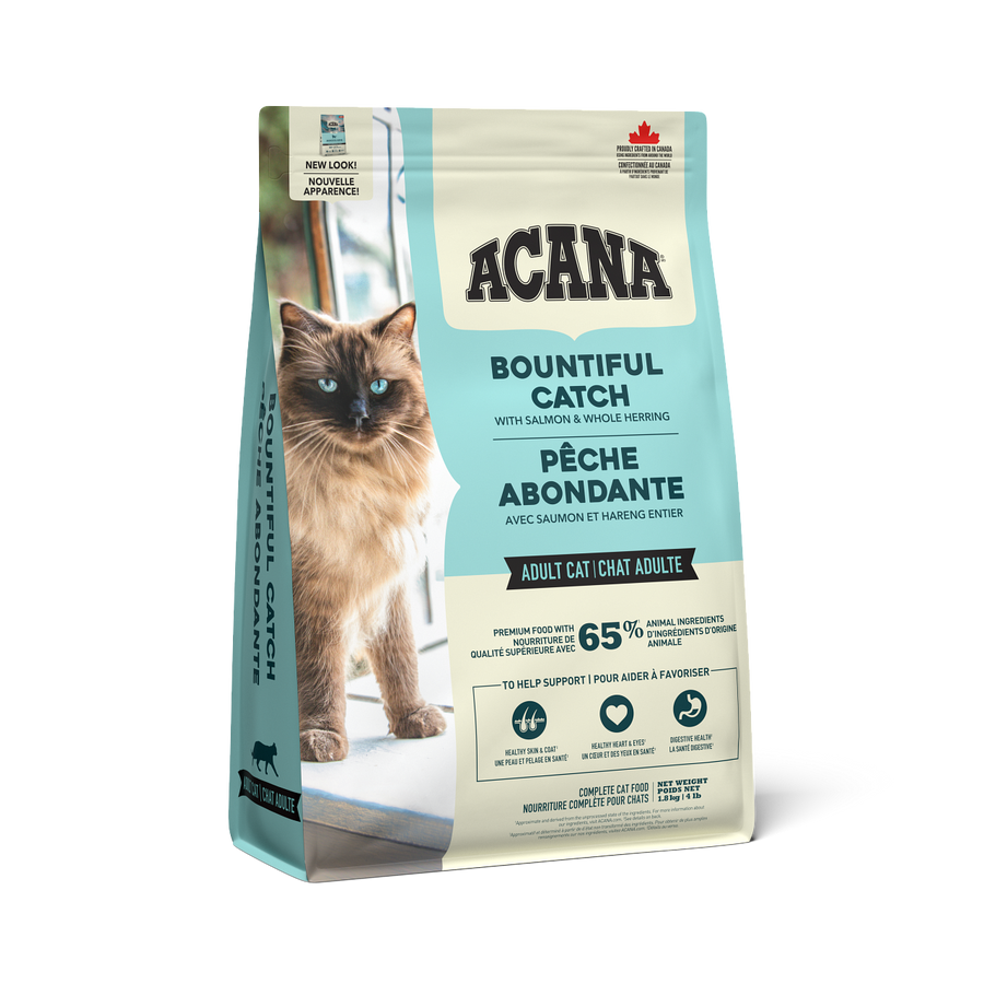 Feed your little wildcat a diet packed with whole fish ingredients. ACANA Bountiful Catch is loaded with quality fish ingredients from wild-caught salmon & herring, and rainbow trout, in richly nourishing WholePrey ratios of fish, organs, and bone, so your cat is getting the nutrients they need, naturally.