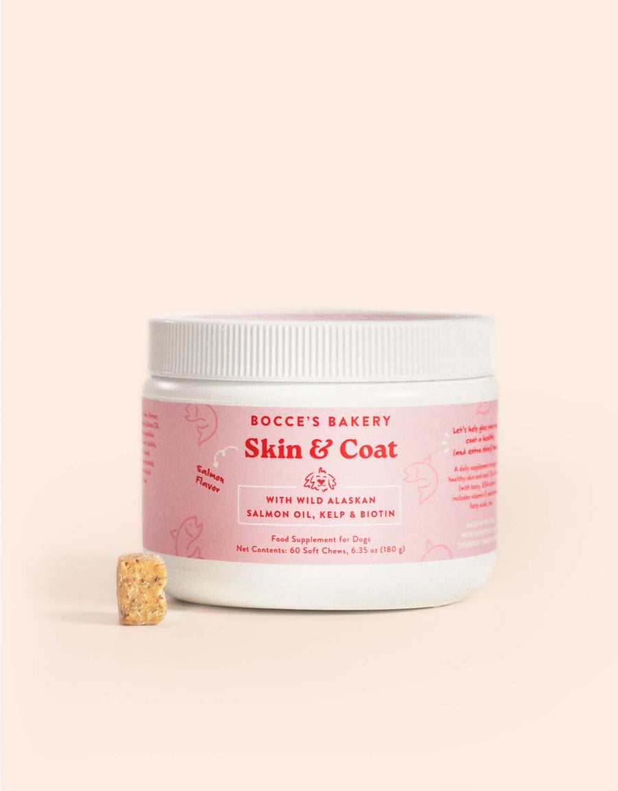 Let's help give your pup's coat a healthy (and extra shiny!) boost. A daily supplement to support healthy skin and coat. Our formula (with tasty, USA salmon!) includes vitamin E and essential fatty acids, too.