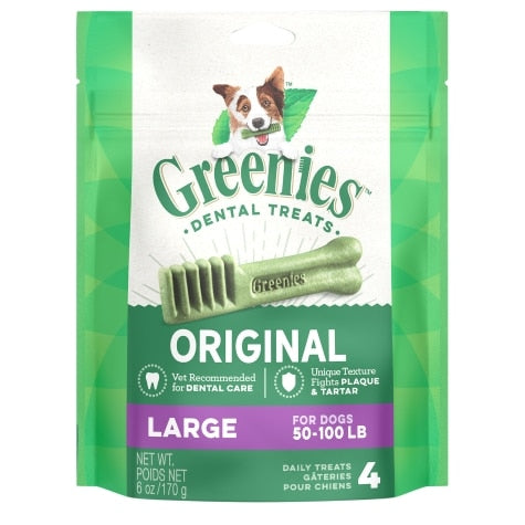 Support your furry sidekick's dental health with Greenies Large Dental Dog Treats! These delicious original flavor dental dog treats are crafted with an irresistibly chewy texture that helps remove plaque and tartar. These natural dog treats are vet recommended for at-home oral health care because they help promote oral hygiene, freshen breath and contain highly soluble ingredients that are safe and easy for your pup to digest. Plus, you can feel extra confident knowing that these whisker-licking treats promote your canine companion's overall health with vitamins, minerals and other nutrients!