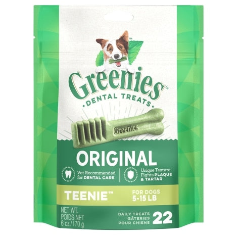 Support your furry sidekick's dental health with Greenies Teenie Dental Dog Treats! These delicious original flavor dental dog treats are crafted with an irresistibly chewy texture that helps remove plaque and tartar. These natural dog treats are vet recommended for at-home oral health care because they help promote oral hygiene, freshen breath and contain highly soluble ingredients that are safe and easy for your pup to digest. Plus, you can feel extra confident knowing that these whisker-licking treats promote your canine companion's overall health with vitamins, minerals and other nutrients! These treats are paw-fect for toy breeds and dogs between 5 and 15 lbs.