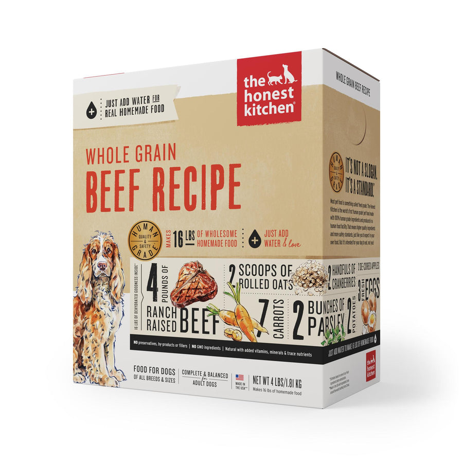 The Honest Kitchen Whole Grain Beef Recipe Dehydrated Dog Food is crafted with human grade, whole foods to provide your pet with some of the best nutrition possible! This whole grain recipe is formulated with uncompromising quality control standards using real, recognizable ingredients, like ranch-raised beef, that are gently dehydrated to maintain nutrient and taste. And to meet The Honest Kitchen's 100% human-grade standard, the same whole foods you'd recognize in your own kitchen are used to make this recipe. Plus, this dog food is made in a human food facility! To serve, simply add warm water and wait three minutes for a fur-esher, homemade meal your canine companion will go head over tail for!