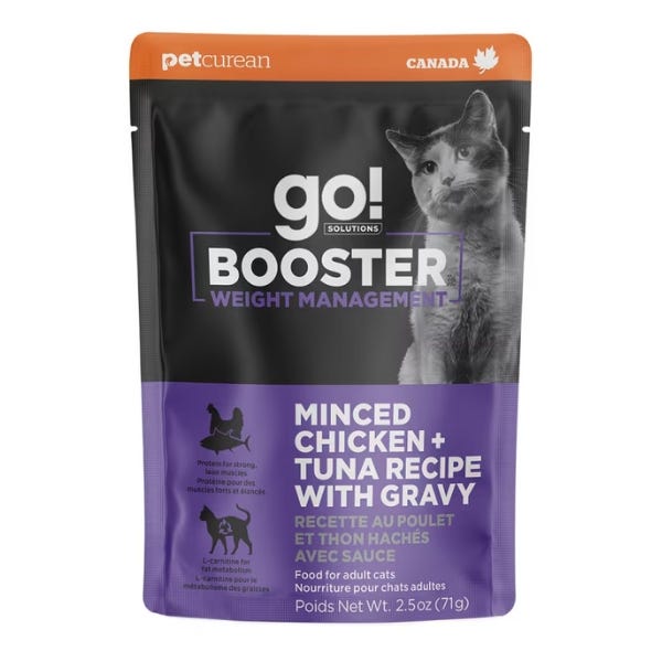 Go! Solutions Weight Management Booster for Cats - Minced Chicken & Tuna with Gravy Recipe can be fed as a treat, a topper, or as a complete and balanced diet for adult and senior cats of all breeds.