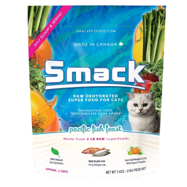 Smack Pacific Fish Feast Dehydrated Cat Food is not just your typical cat food. It's raw, dehydrated food that is great for cats of all breeds and life stages. Your cat will love the savoury combination of real, wild Pacific rockfish and herring (bones & organs in) and fresh, fruits and vegetables, neither of which have been treated with antibiotics or artificial preservatives.