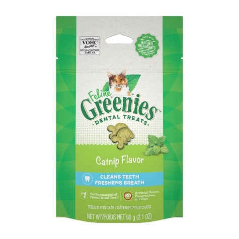 Keep your feline friend's purr-ly whites healthy and clean with FELINE GREENIES Adult Dental Cat Treats, Catnip Flavor. Designed to help clean teeth, reduce tartar buildup and freshen your cat's breath, these crunchy treats are made with natural ingredients plus added vitamins, minerals and other nutrients that make them a nutritionally complete and balanced snack for an adult cat. What's more, they contain no artificial flavors, preservatives and are fewer than 2 calories per treat. These goodies are the purr-fect size for cat toys”try placing a few inside a treat dispenser toy and watch your paw-tner chase and swat away!