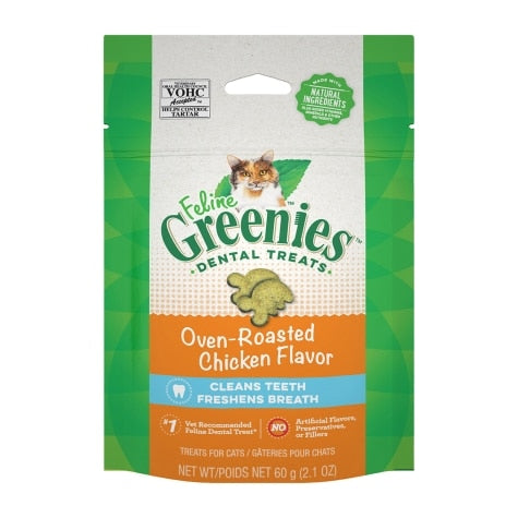 Keep your feline friend's purr-ly whites healthy and clean with FELINE GREENIES Adult Dental Cat Treats, Oven Roasted Chicken Flavor. Designed to help clean teeth, reduce tartar buildup and freshen your cat's breath, these crunchy treats are made with natural ingredients plus added vitamins, minerals and other nutrients that make them a nutritionally complete and balanced snack for an adult cat. What's more, they contain no artificial flavors, preservatives and are fewer than 2 calories per treat. Let your pampered pal crunch away on this yummy chicken-flavored treat that's paw-some for the teeth and the tummy!