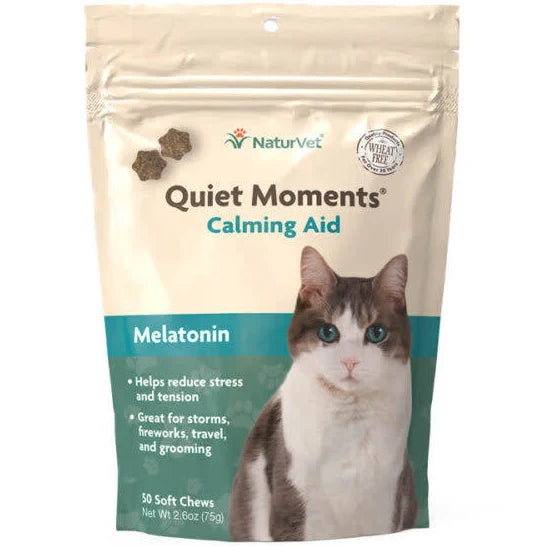 Help calm your cat's anxiety and feel comfortably calm with NaturVet Quiet Moments calming aid. These chews are a natural solution to calming your pet and are boosted with Melatonin-a natural chemical the body produces before bedtime. NaturVet's unique blend of Thiamine and L-Tryptophan will help reduce stress and tension, while ginger supports sensitive stomachs. This combination helps to promote rest and relaxation, especially during traveling, storms or trips to the veterinarian.