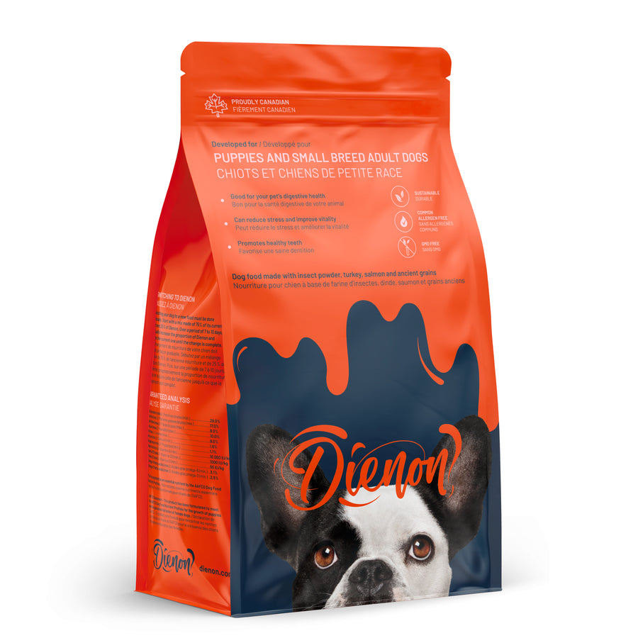 Dienon brings a recipe that mixes high-quality and sustainable proteins (turkey, salmon and insects) with ancient grains and supplements to ensure optimal development of your dog. No flours or fillers, just superfoods.