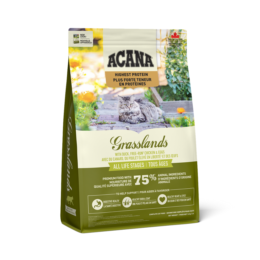 Cats require a diet rich in animal protein. Inspired by our vast grasslands and cold northern lakes, ACANA Grasslands is brimming with free-run chicken, turkey, and duck, cage-free eggs, and wild-caught fish, in WholePrey ratios of meat, organs, cartilage, and bone. Give your cat the best ingredients and a recipe that will keep them happy, healthy, and strong.
