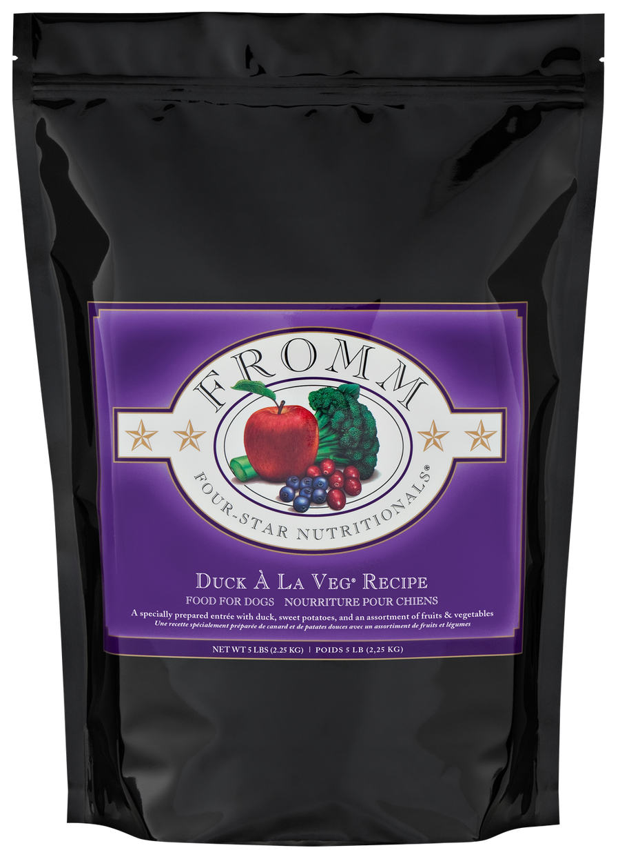 Fromm Four-Star Duck a La Veg® Recipe Food for Dogs is a delicious entrée of duck, sweet potatoes, and an assortment of fruits and vegetables. This distinctive blend is specially prepared to ensure consistency, quality, and superior taste in each and every bowl. Duck a La Veg® Recipe provides complete and balanced nutrition for dogs of all ages and can be alternated with other Fromm Four-Star recipes.