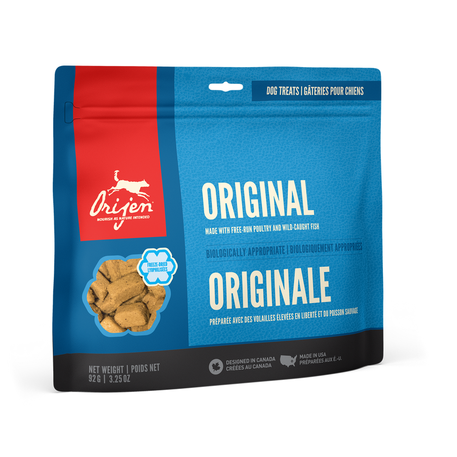 ORIJEN Freeze-Dried Treats are crafted with the same quality ingredients that make up ORIJENs trusted foods. This Original recipe is made with raw free-run chicken and turkey, and wild-caught fish that are gently freeze-dried to lock in their rich nutrients, for a treat that is as healthy as it is delicious.