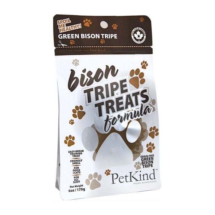 Petkind Tripe Treats are a nutritious dog treats containing primarily bison tripe. Tripe is a nutrient-rich stomach lining that absorbs digestive juices, making it easily digestible, and contains naturally occurring omega 3 & 6 fatty acids for healthy skin & coat. To top it off, it contains a friendly odour making it easy to use, and is completely sourced from Canada and USA!