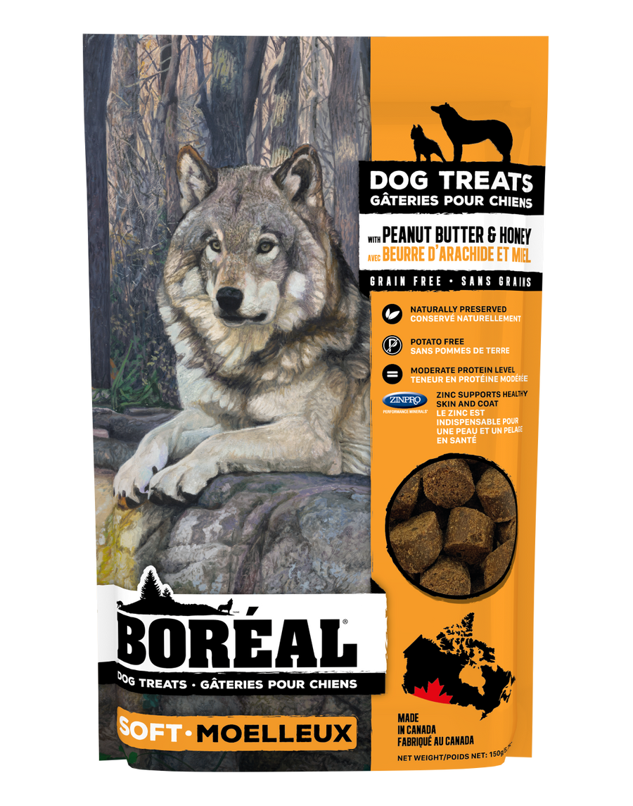 New BOREAL Dog Treats are a tasty dog treat with added zinc to help skin and coat. Our very Canadian flavours are made using local salmon, duck and honey. BOREAL pet food products are made of low glycemic index ingredients to improve your pet's health. Each treat contains up to 6.5 mg of zinc for good skin and coat with Availa®Zn organic zinc. Two treats per 35 lbs of body weight provide 13 mg of zinc. Based on buckwheat flour, our treats are grain free and gluten free. Buckwheat is not related to wheat, as it is not a grass; instead, buckwheat is related to sorrel, knotweed, and rhubarb.