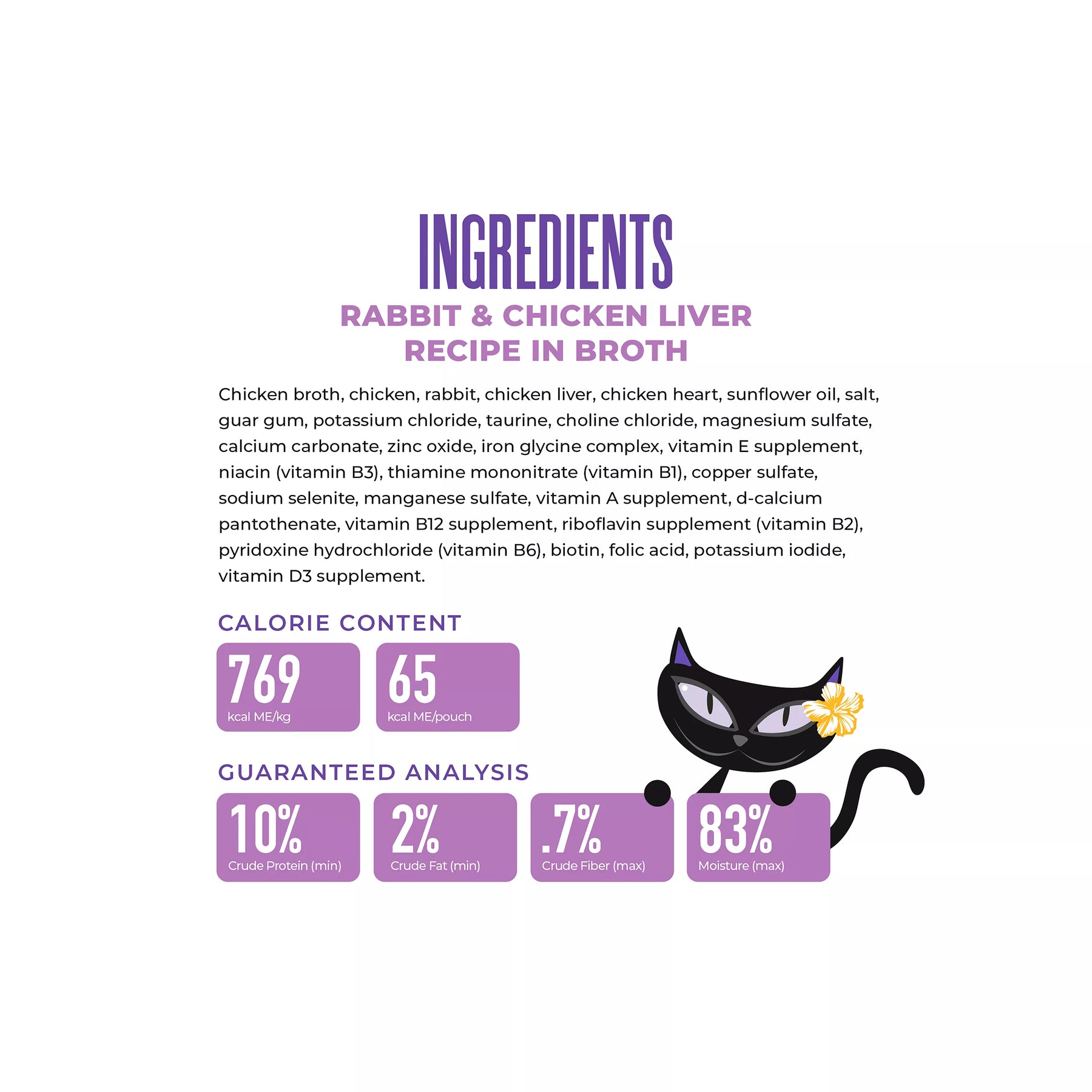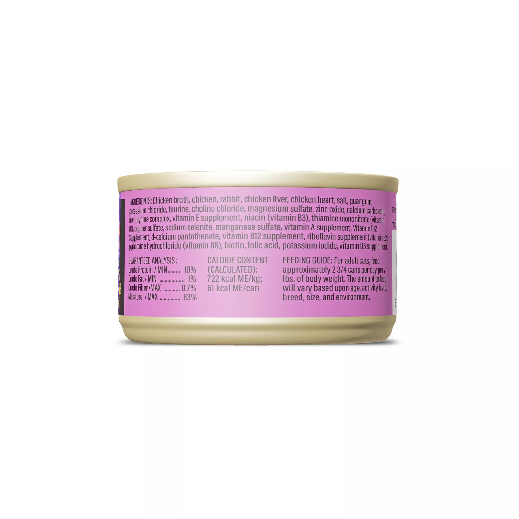 Chicken broth, chicken, rabbit, chicken liver, chicken heart, sunflower oil, salt, guar gum, potassium chloride, taurine, choline chloride, magnesium sulfate, calcium carbonate, zinc oxide, iron glycine complex, vitamin E supplement, niacin (vitamin B3), thiamine mononitrate (vitamin B1), copper sulfate, sodium selenite, manganese sulfate, vitamin A supplement, d–calcium pantothenate, vitamin B12 supplement, riboflavin supplement (vitamin B2), pyridoxine hydrochloride (vitamin B6), biotin, folic acid, potassium iodide, vitamin D3 supplement.