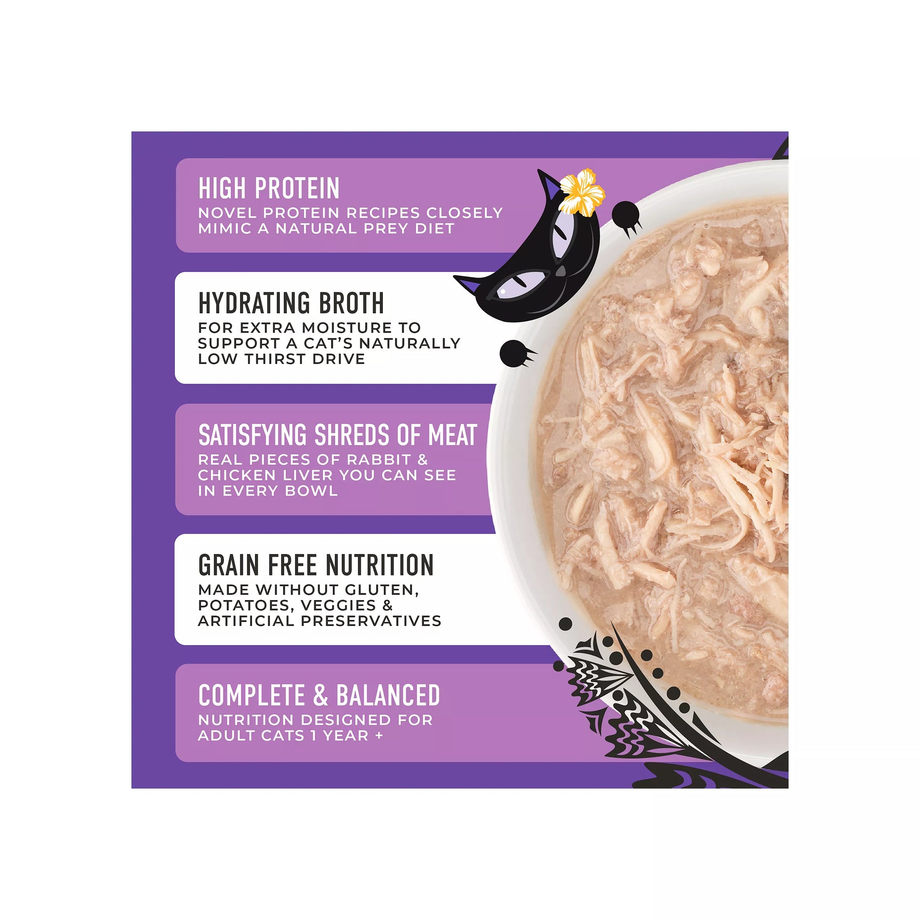 Your cat shares the same carnivorous appetite of her wild ancestors. Feed her what she craves with After Dark(R) Shreds Rabbit and Chicken Liver Recipe that is protein–rich, with a high moisture content that closely mimics a natural prey diet. Made with nutrient–dense organ meat and delicious shreds of real rabbit and morsels of delicious organ meat. Grain free with no artificial preservatives.