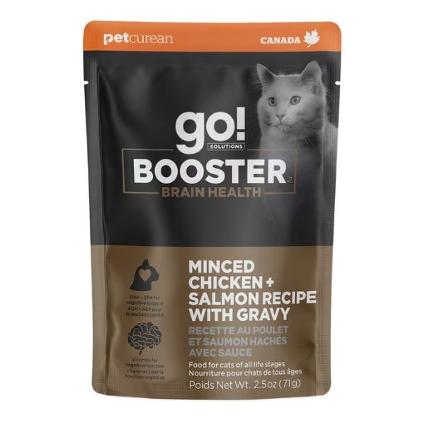 Go! Solutions Brain Health Booster for Cats - Minced Chicken and Salmon with Gravy Recipe can be fed as a treat, a topper, or as a complete and balanced diet for cats of all breeds and life stages.
