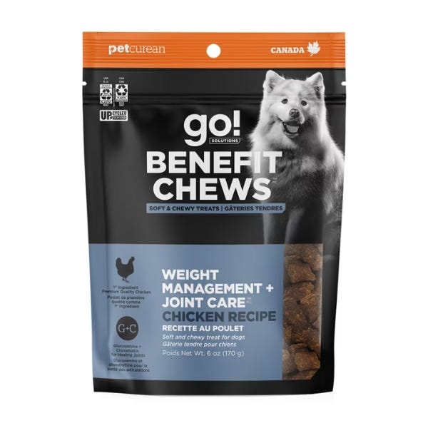 Go! Solutions Weight Management & Joint Care Benefit Chews For Dogs - Chicken Recipe is crafted as a supplemental treat to enhance your pet's regular diet, perfect for occasional indulgence or as a special reward. Serve as a treat and ensure to reseal the bag to maintain freshness after opening. To keep your dog in tip-top shape, we recommend these treats make up no more than 10% of their daily caloric intake.