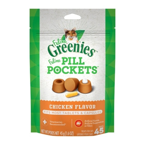 When it comes to your feisty feline, a delicious treat certainly helps the medicine go down. FELINE GREENIES PILL POCKETS Natural Cat Treats, Chicken Flavor are soft treats that mask the taste of medicine with delicious chicken flavor. To use, simply place your cat's medicine inside the moldable pill pocket, pinch the pocket closed until the pill is hidden and give the treat to your cat - it's that easy! Even more meow-velous, these treats contain no artificial flavors, preservatives or fillers and are made with natural ingredients plus minerals and trace nutrients. It's the purr-fect, worry-free way to make sure your cat takes her pill.