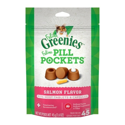 When it comes to your feisty feline, a delicious treat certainly helps the medicine go down. FELINE GREENIES PILL POCKETS Natural Cat Treats, Salmon Flavor are soft treats that mask the taste of medicine with delicious salmon flavor. To use, simply place your cat's medicine inside the moldable pill pocket, pinch the pocket closed until the pill is hidden and give the treat to your cat - it's that easy! Even more meow-velous, these treats contain no artificial flavors, preservatives or fillers and are made with natural ingredients plus minerals and trace nutrients. It's the purr-fect, worry-free way to make sure your cat takes her pill.