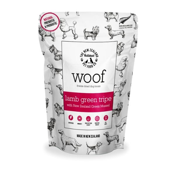 Woof Freeze-Dried Lamb Green Tripe recipe uses green lamb tripe and New Zealand green mussels. These irresistible treats are easy to break apart and are great as an everyday reward or for training, puzzle toys, or food topper.