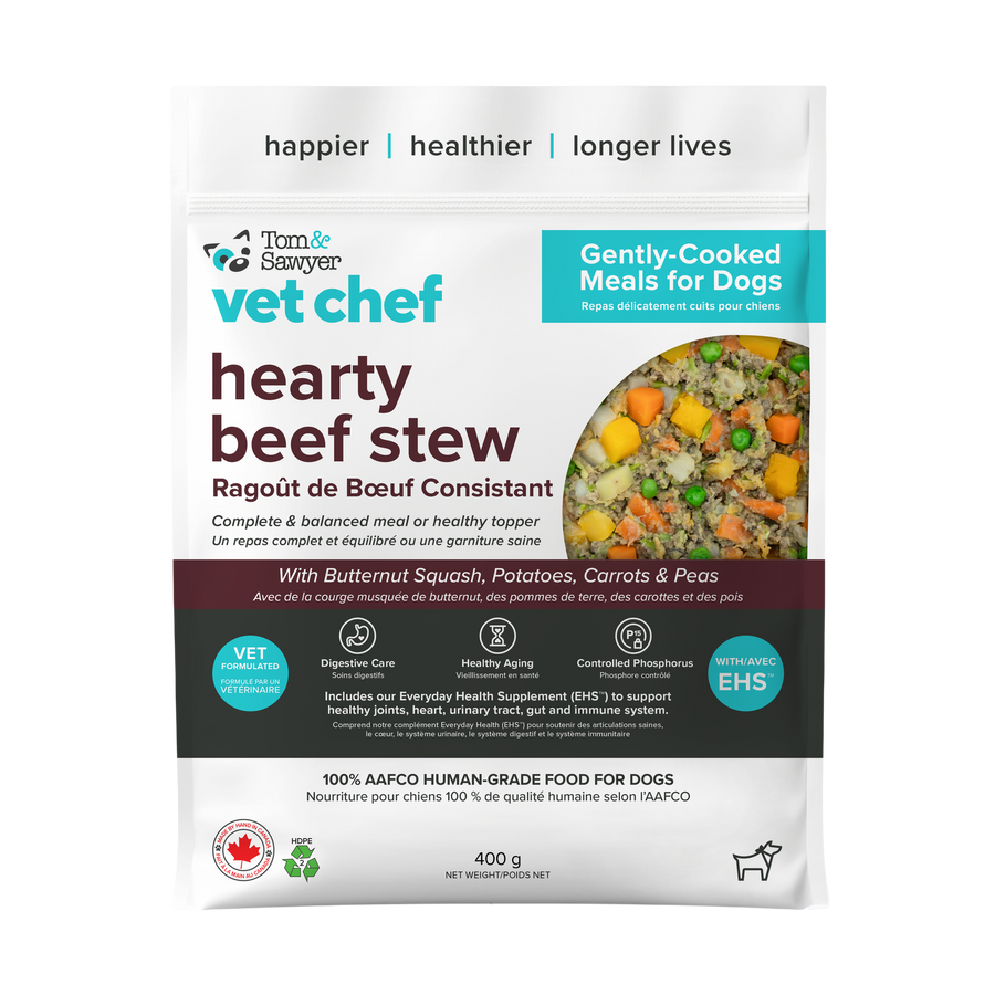 Boost your dog’s digestive health with Tom&Sawyer VetChef's Hearty Beef Stew, a nutrition-packed, lip-smacking medley of our chef- and vet- selected ingredients, including ground beef, beef heart, butternut squash, potatoes, carrots and peas. This gluten- and grain-free meal is high in omega-3s and low in phosphorus to support healthy aging.